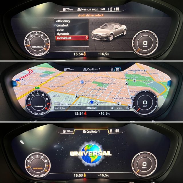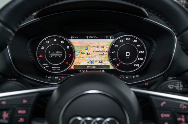· Audi Virtual cockpit: strumentazione digitale con display LCD da 12,3 pollici con interfaccia multi-media MMI Navigation Plus, navigatore satellitare, MMI di comando touch nella plancia centrale, Bluetooth®, lettore CD/DVD, 2 USB, Aux, 2 SD