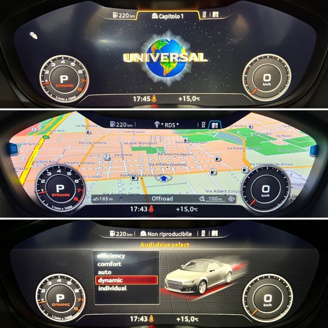 · Audi Virtual cockpit: strumentazione digitale con display LCD da 12,3 pollici con interfaccia multi-media MMI Navigation Plus, navigatore satellitare, MMI di comando touch nella plancia centrale, Bluetooth®, lettore CD/DVD, 2 USB, Aux, 2 SD